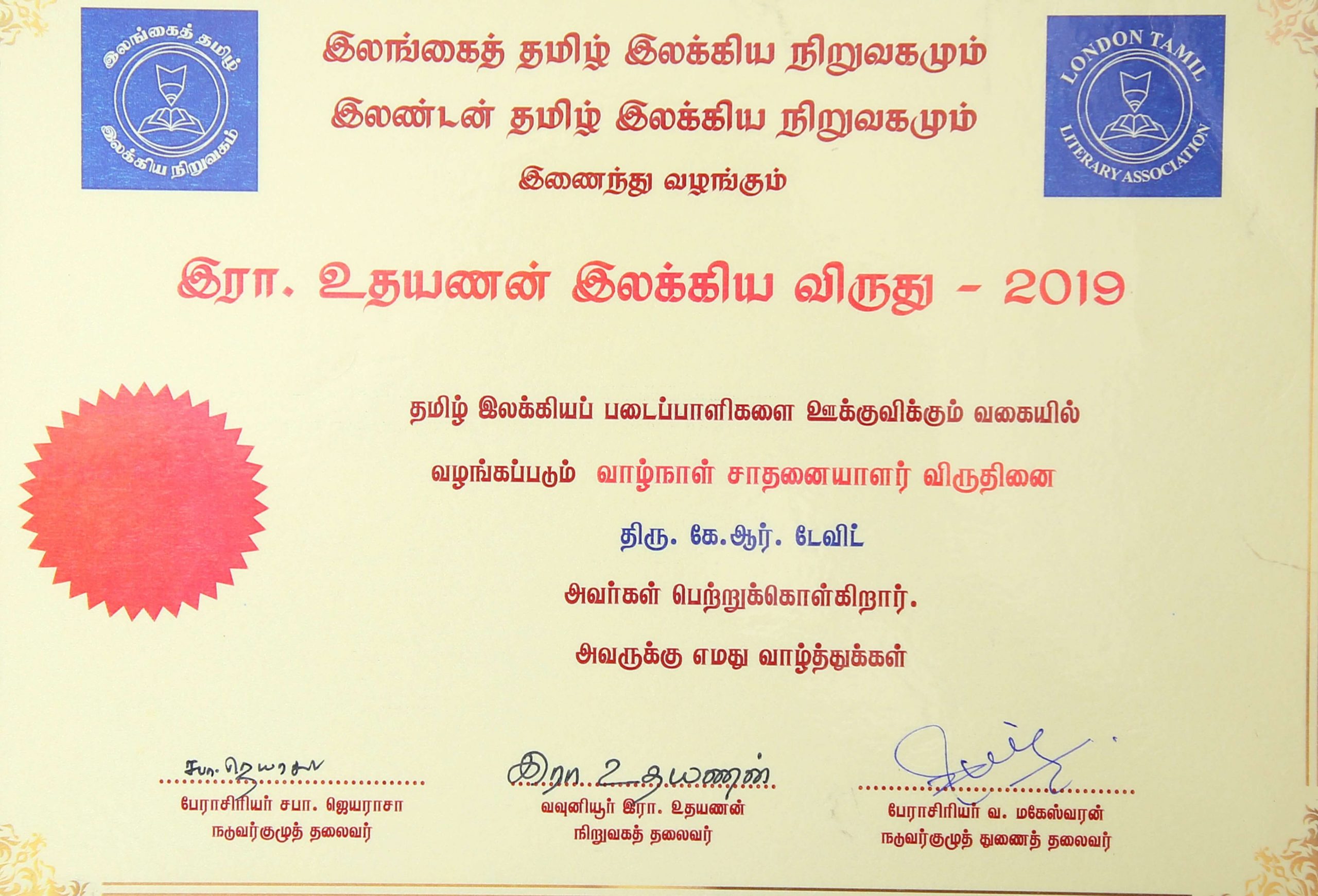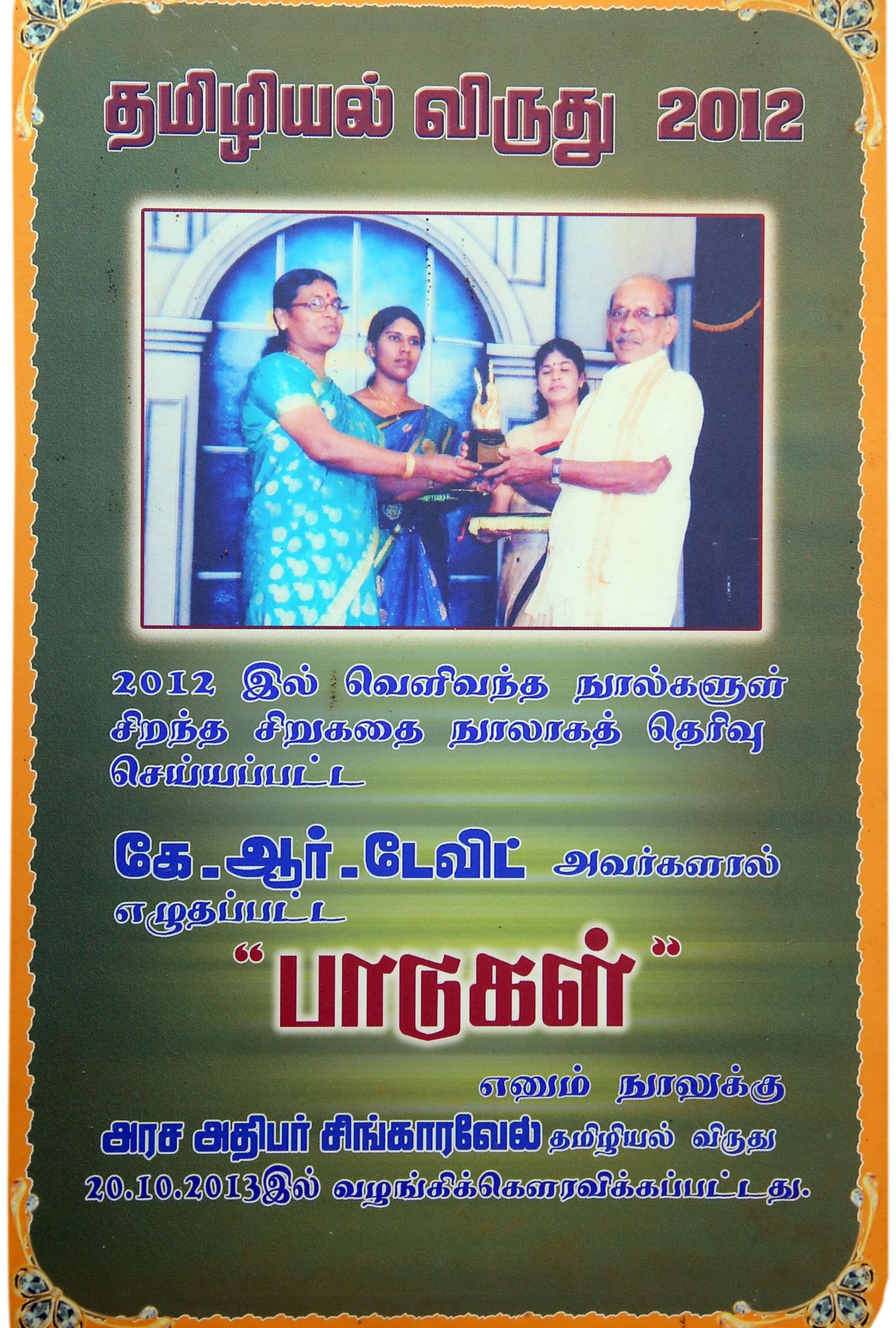 2021 “கே.ஆர்.டேவிற் சிறுகதைகள்”என்னும் சிறுகதைத் தொகுதி நூலுக்காக வடக்கு மாகாண சிறந்த இலக்கிய நூற்பரிசினையும் பெற்றுக் கொண்டவர்.