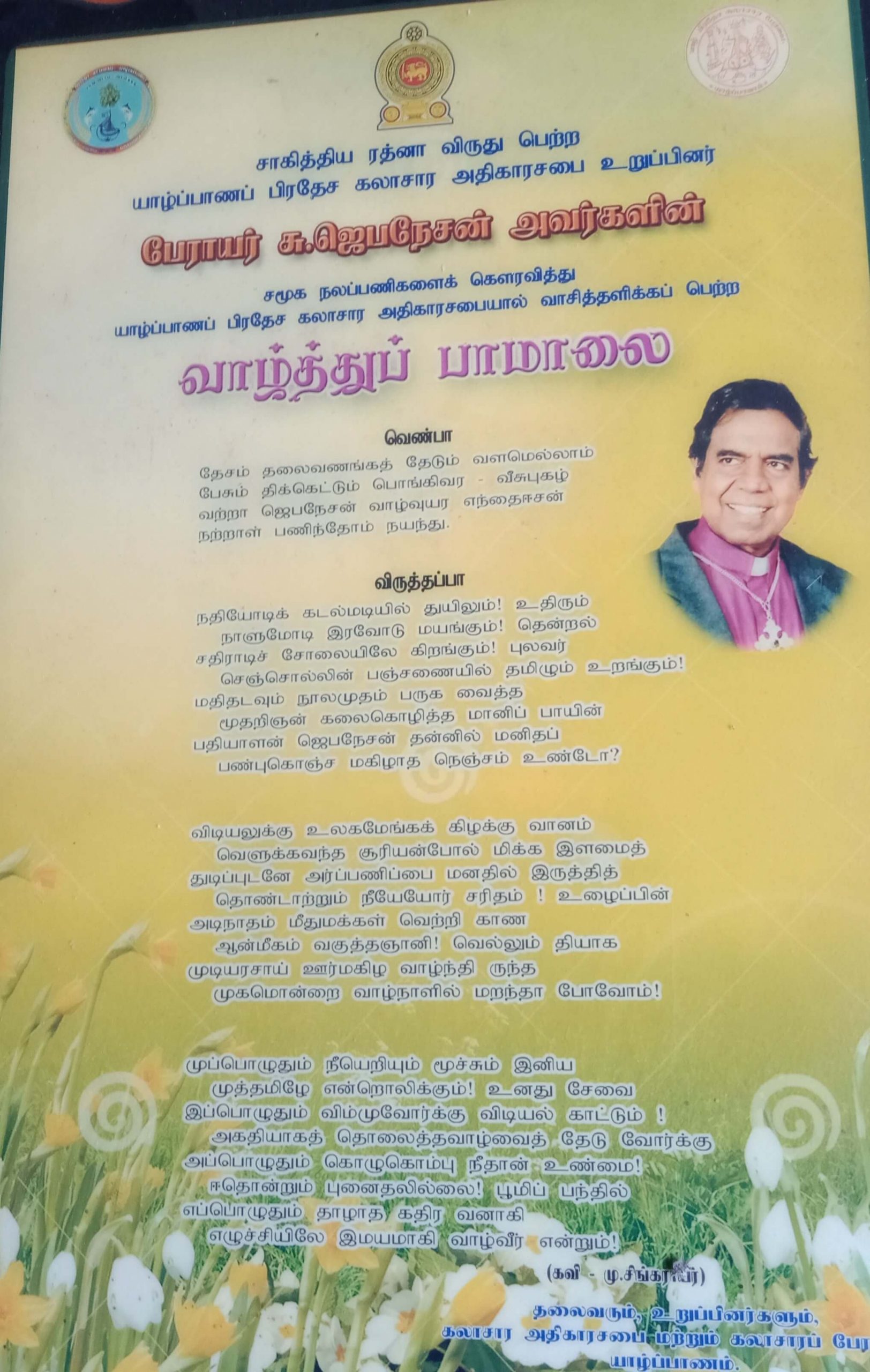 தனது இரண்டு வயது வரை மானிப்பாயில் வசித்துப் பின்னர் சாவகச்சேரியை  நிரந்தர வாழிடமாக அரவணைத்துக் கொண்டார். பிறக்கும் போதே நோயாளியாகப் பிறந்த ஜெபநேசன் அவர்கள் தாயின் உன்னத கவனிப்பாலும்; “இந்தப் பிள்ளை சுகம் பெற்று வாழுமானால் இவனை உமது பணிக்கே விட்டு விடுகிறோம்” என தந்தையாரின் வேண்டுதலினாலும் ஆண்டவரினால் ஜெபநேசன் அவர்கள் குணமாக்கப்பட்டுக் கல்வி மற்றும் இறையியல் கற்கைகளில் மேன்நிலையடைந்து தென்னிந்தியத் திருச்சபையின் பேராயராக உயர்ந்து உன்னதமான ஆன்மிகப் பணி செய்தவர்.