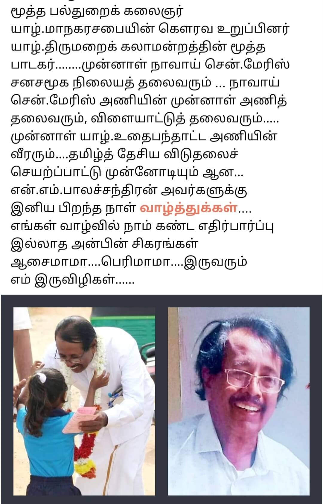 பன்முக ஆற்றலும் ஆளுமையும் கொண்ட கலைஞர் என்.எம்.பாலச்சந்திரன் அவர் கள் எம் சமூகத்திற்காற்றிய கலைச்சேவையினை ஆவணப்படுத்தி அடுத்த தலைமுறையினருக்கு கையளிப்பதில் யாழ்ப்பாணப்பெட்டகம் – நிழலுருக்கலைக் கூடம் பெருமையடைகின்றது. இவ்வாக்கத்தினை உருவாக்குவதற்கு ஒத்துழைப்பு வழங்கிய அவரது புதல்வியான ஆன் அவர்களுக்கும் மனமார்ந்த நன்றி.