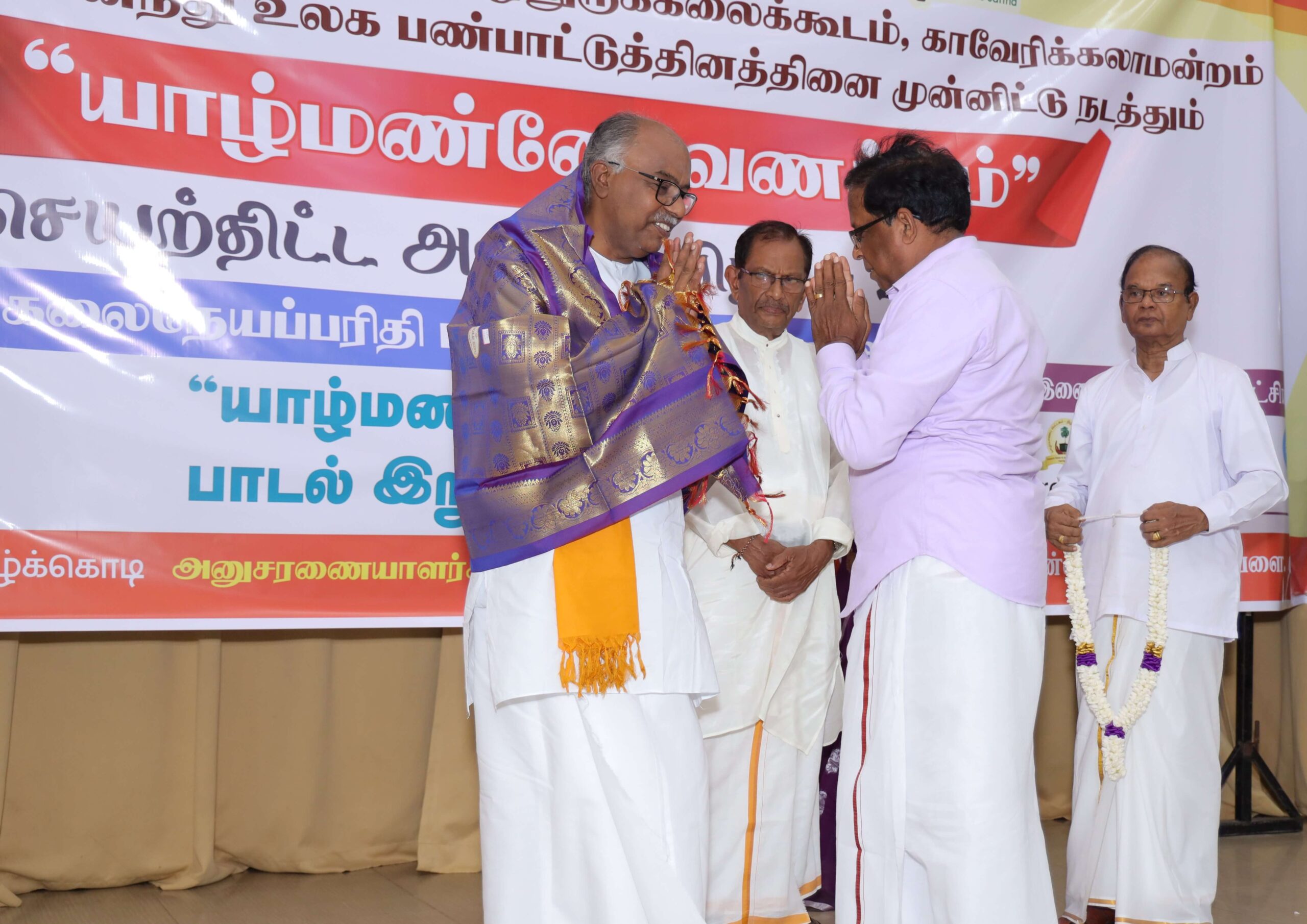 விருது பெறுவோரை யாழ்பல்கலைக்கழகத்தின் முன்னாள் துணைவேந்தர் வாழ்நாட்பேராசிரியர் கலாநிதி நா.சண்முகலிங்கன் அவர்கள் வாழ்த்தி மாண்பேற்றம் செய்தார். இந்த வகையிலே சைவசமயம் மற்றும் சமூகம்சார்ந்த அறக்கொடைப் பணிகளுக்காக செஞ்சொற்செல்வர் கலாநிதி ஆறுதிருமுருகன் அவர்கள் சிவத்தமிழ்ஞாயிறு என்னும் விருது வழங்கியும் அறக்கொடைப் பணிகளுக்காக தியாகி அறக்கொடை நிறுவுனர் திருவாளர் வாமதேவா தியாகேந்திரா அவர்களுக்கு பணிநேயப்பரிதி என்னும் விருது வழங்கியும் தமிழ்ப்பணிகளுக்காக பேராசிரியர் எஸ்.சிவலிங்கராசா அவர்களுக்கு பணித் திருந்தகை என்னும் விருது வழங்கியும் மாண்பேற்றம் செய்யப்பட்டனர். கலாசாரஉத்தியோகத்தர்களாகப் பணியாற்றி ஓய்வுபெற்ற திருவாட்டி மேகலைச் செல்வி இந்திரகுமார், பத்மராணி சிவஞானராசா ஆகிய இருவரது கலாசாரச் சேவையினை விதந்து கௌரவிக்கப்பட்டனர்.